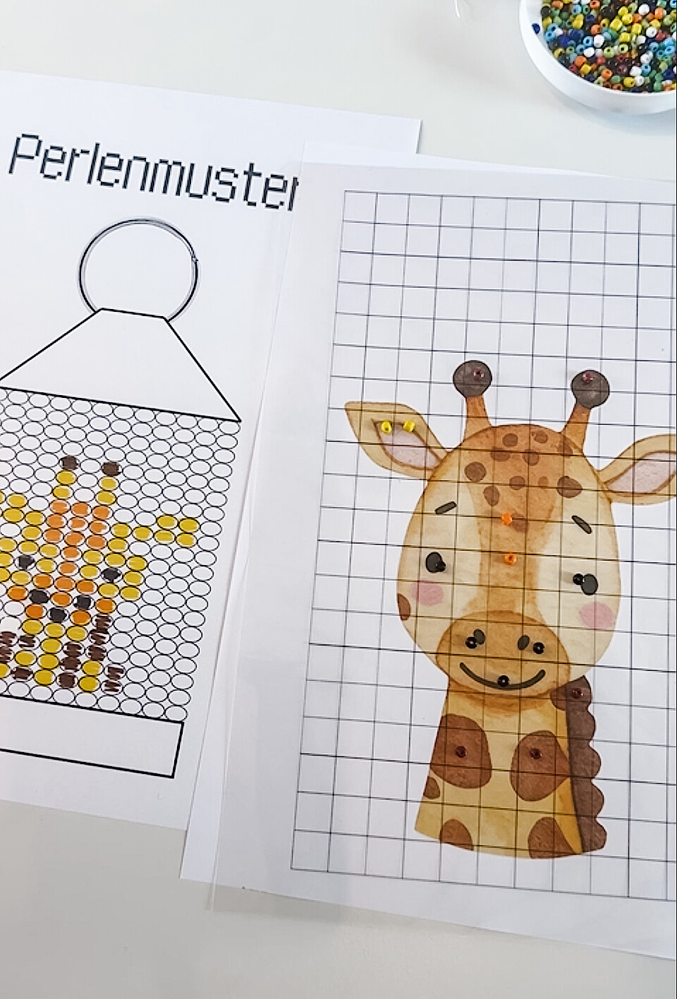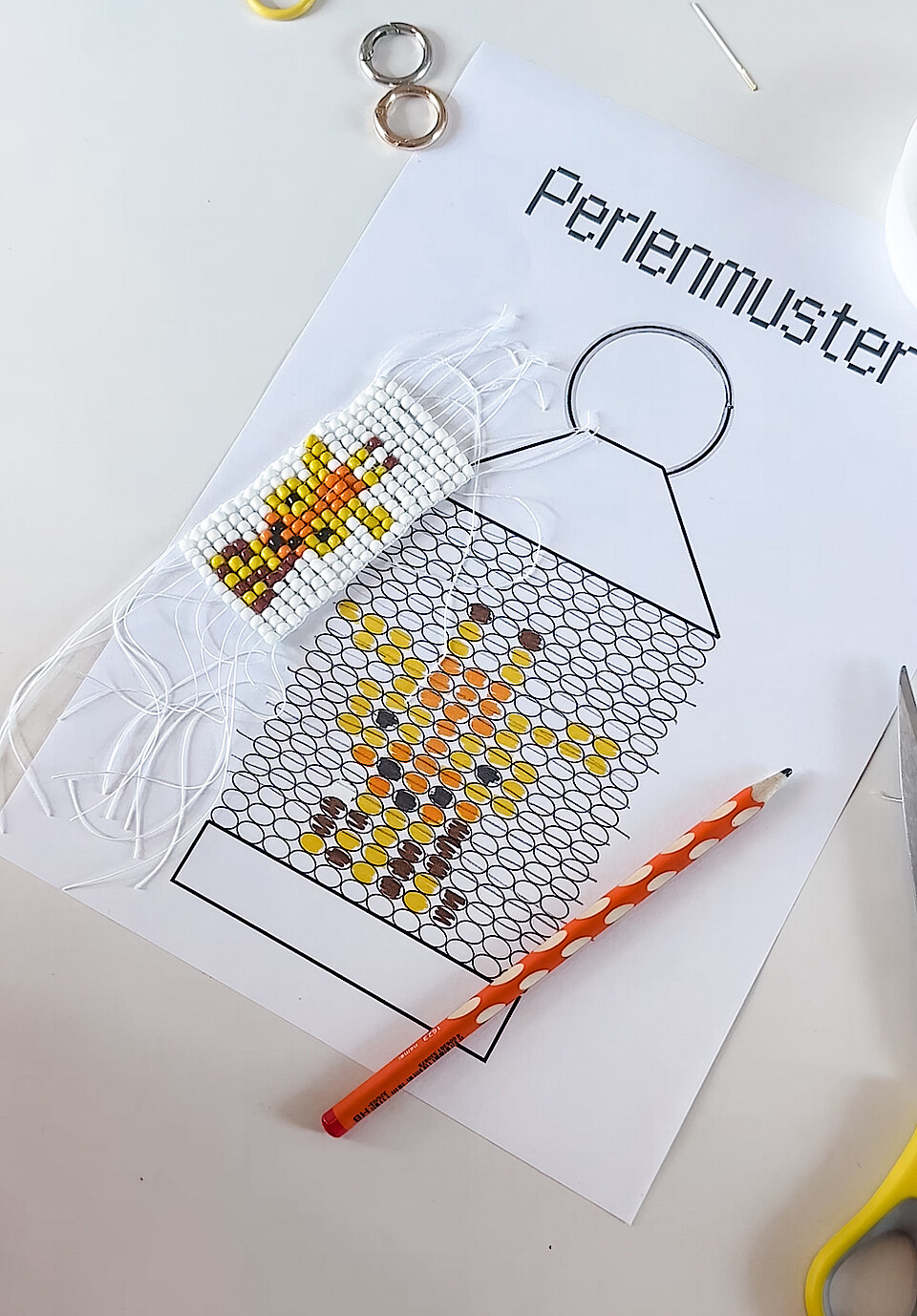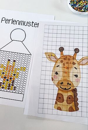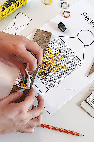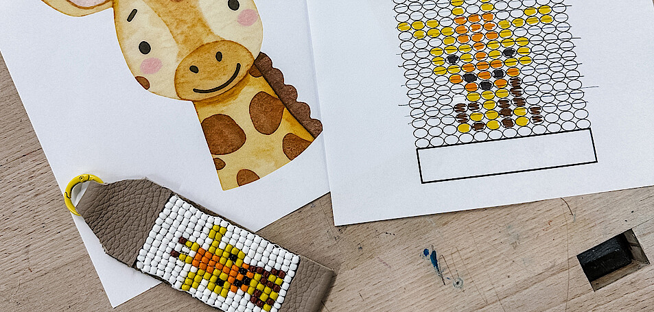 In einem ersten Schritt suchen die Kinder ein Bild aus und übertragen dieses auf kariertes Papier. Damit das Motiv erkennbar bleibt, müssen die Kinder logisch vorgehen – und manchmal auch erlernte Regeln hinterfragen. Mit dem fertigen Webplan ist es Zeit für die feinmotorische Arbeit. Ich leite das Verweben der Perlen an. Für mehr Stabilität und ein rundes Gesamtbild wird das Pixelbild am Schluss auf ein Stück Leder geklebt und mit einem Ring zum Schlüsselanhänger zusammengesetzt.