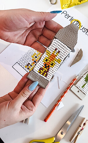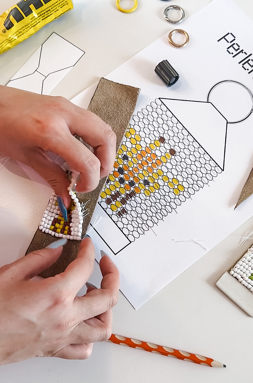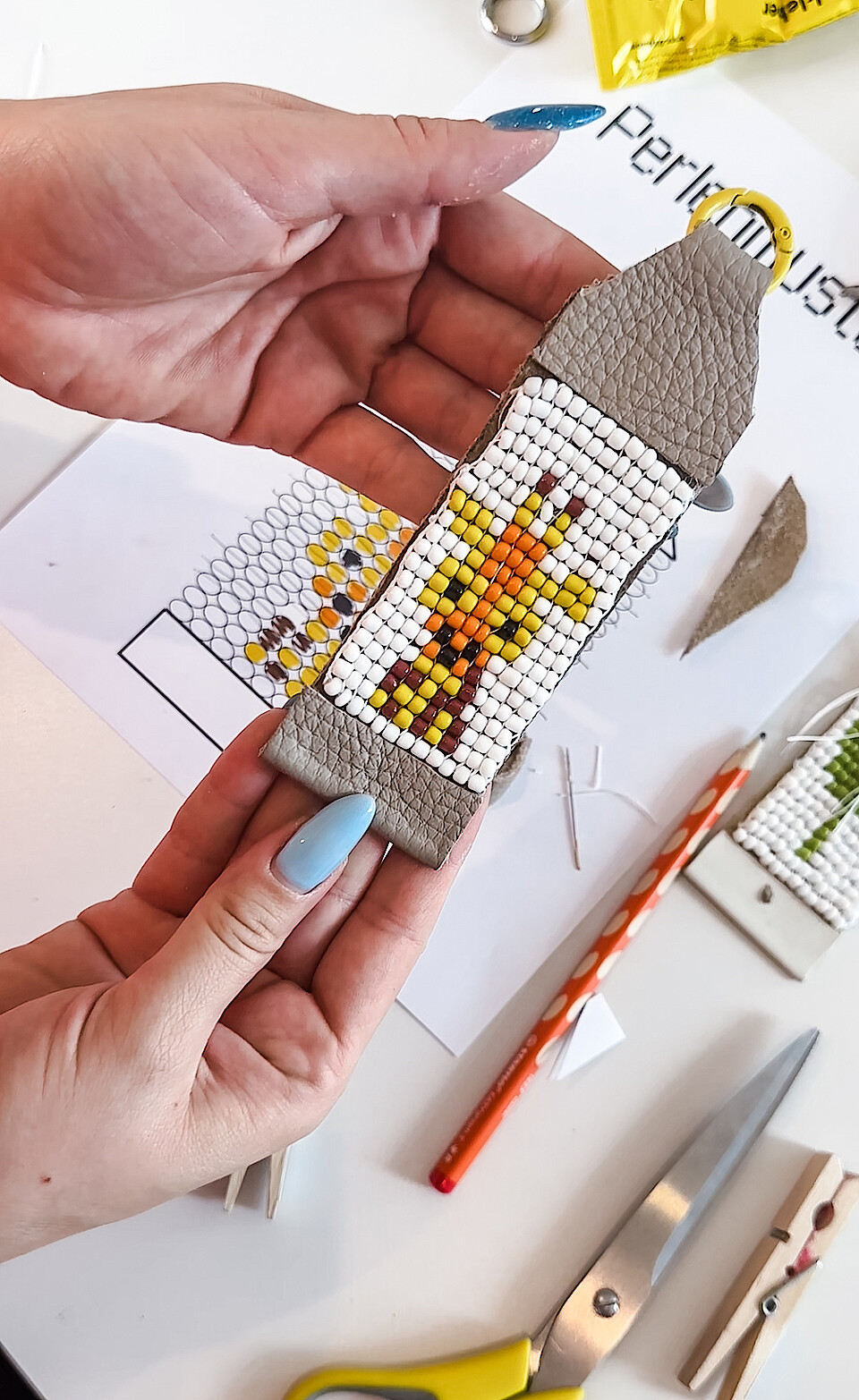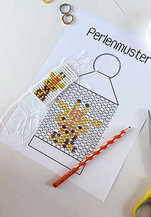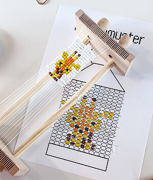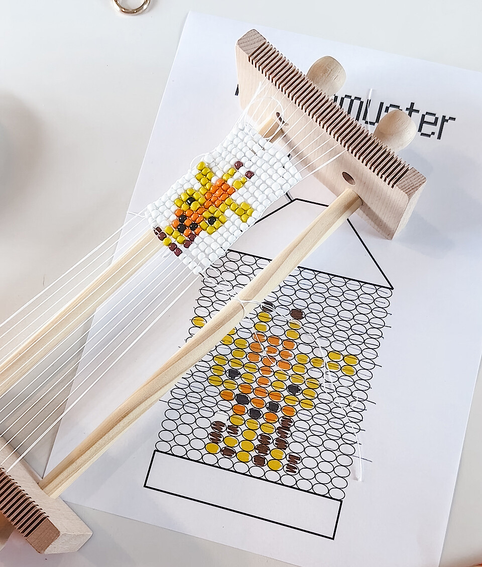 In einem ersten Schritt suchen die Kinder ein Bild aus und übertragen dieses auf kariertes Papier. Damit das Motiv erkennbar bleibt, müssen die Kinder logisch vorgehen – und manchmal auch erlernte Regeln hinterfragen. Mit dem fertigen Webplan ist es Zeit für die feinmotorische Arbeit. Ich leite das Verweben der Perlen an. Für mehr Stabilität und ein rundes Gesamtbild wird das Pixelbild am Schluss auf ein Stück Leder geklebt und mit einem Ring zum Schlüsselanhänger zusammengesetzt.