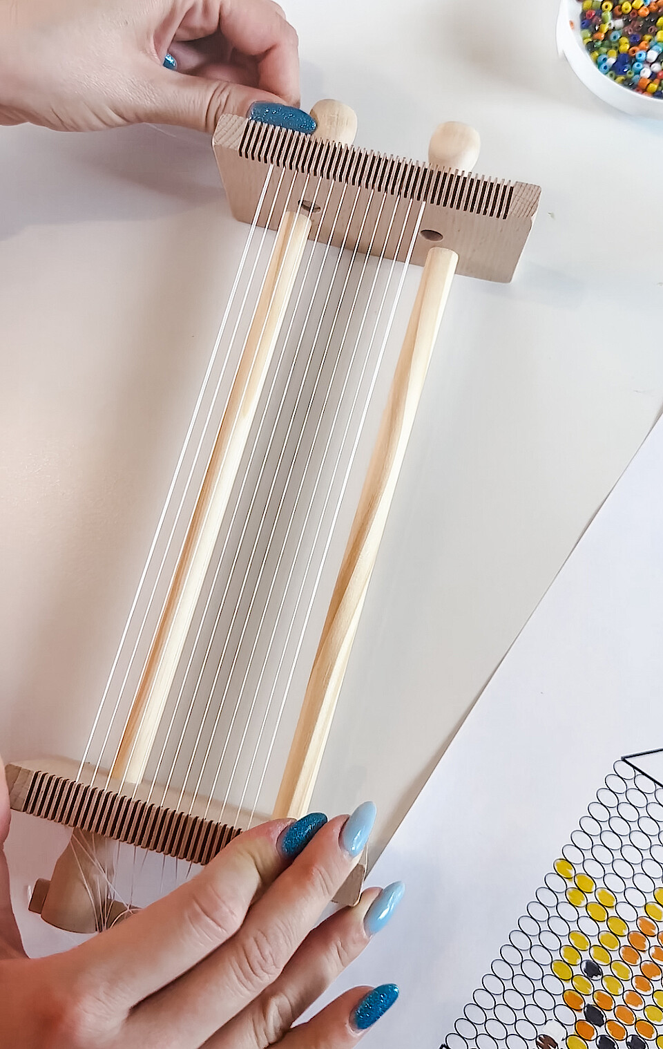 Beim Webprozess muss darauf geachtet werden, dass jede Perle ihren eigenen Platz hat. Der Trägerfaden (mit den Perlen) muss satt angezogen werden. Die Perlen werden nach dem Auffädeln unter die Führungsfäden geführt. Anschliessend wird die Nadel oberhalb der Führungsfäden durch die Perlen zurück zur Anfangsposition geführt.