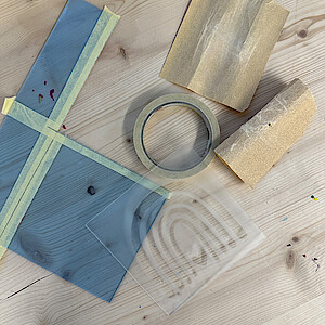 Die freien Plexiglas-Bereiche werden mit einem groben Schleifpapier (z. B. Stärke 80) abgeschliffen. Es ist wichtig, vorsichtig zu arbeiten, damit das Klebeband nicht abgelöst wird. Dieser Vorgang wird mit 1, 2 weiteren Stärken von Schleifpapier wiederholt. Wenn das gewünschte «milchige» Ergebnis erreicht ist, kann das Klebeband abgelöst werden.
