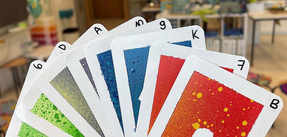 In Gruppen erstellen die Schülerinnen und Schüler eigene Spielkarten. Auf Blankokarten experimentieren sie mit Sprühfarben, stellen Schablonen her und erfahren dabei die Wirkung von Farben.