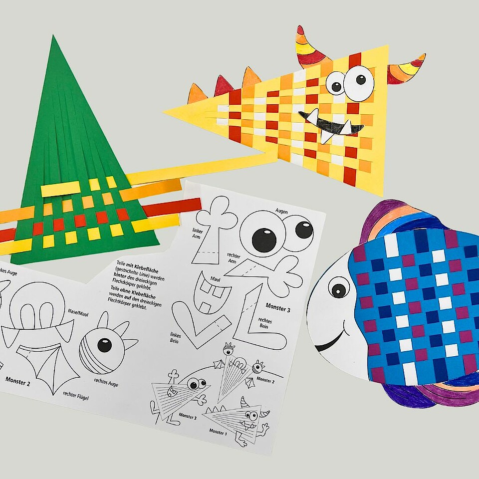 Die ovalen und dreieckigen Flechtrohlinge lassen viel Platz für eigene Ideen. Die unifarbenen Vorlagen erhalten durch das Flechten mit unterschiedlichen Streifen ein buntes Kleid. Präzises Arbeiten ist hierbei wichtig, weshalb diese Flechttechnik besonders für Schülerinnen und Schüler im Zyklus 2 geeignet ist. Anschliessend können aus Zeichenpapier zusätzliche Elemente wie Köpfe, Augen und Beine ausgeschnitten und auf der Rückseite der Flechtarbeit aufgeklebt werden. So entstehen witzige und fantasievolle Tiere oder Kreaturen. Die Schülerinnen und Schüler können entweder die Vorlagen verwenden oder selbst kreativ werden und dabei eigene Elemente entwerfen, ausschneiden und anbringen.